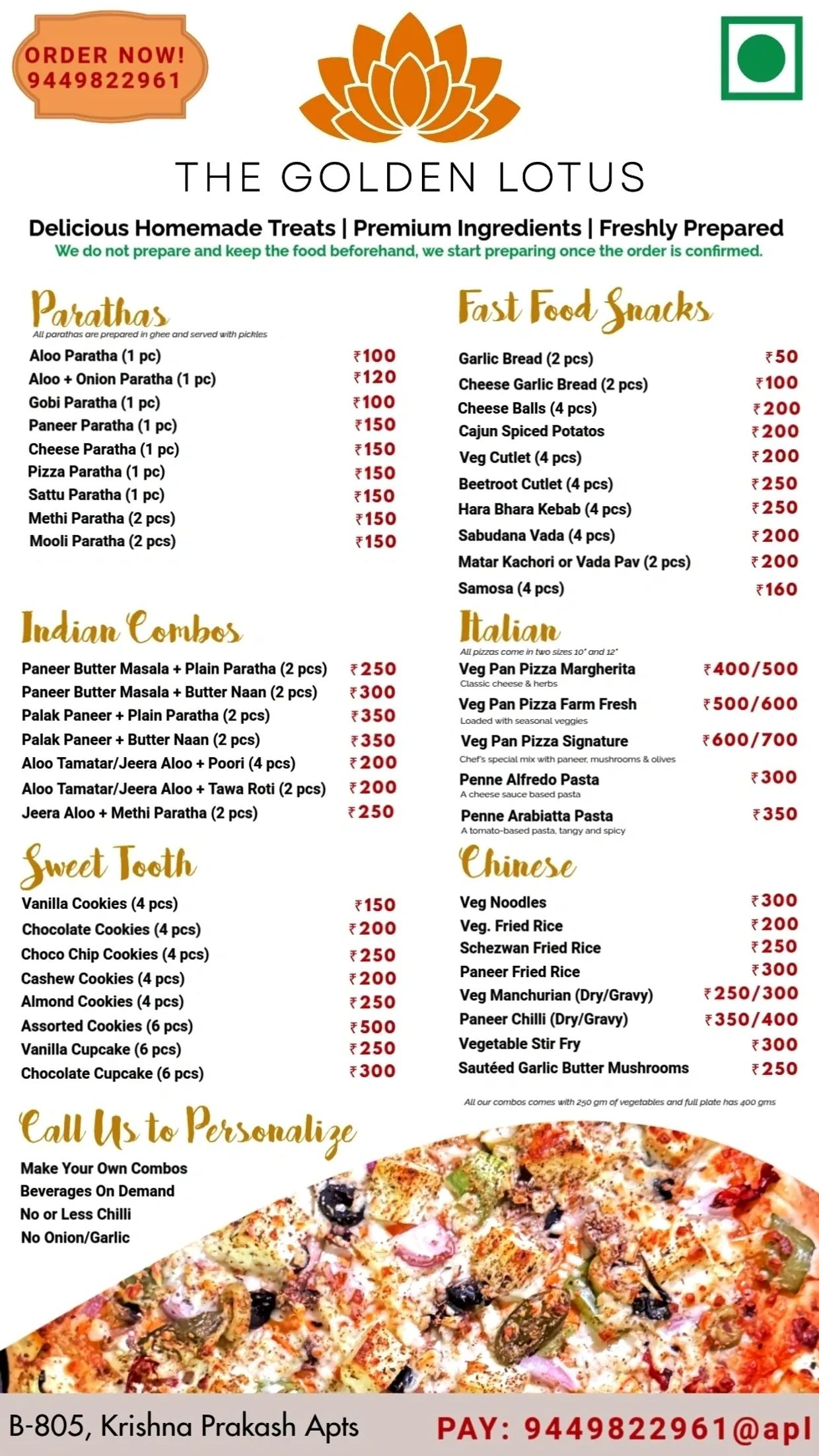 Cottage cheese/paneer in tomato, onion, and nuts gravy with fresh chunks of Capsicum, Onion, tomato with melted butter; accompanied by soft, flaky, and piping hot Parathas
